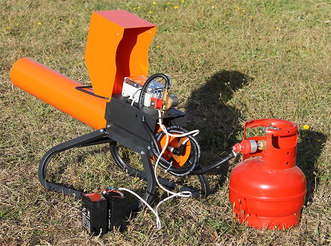 - Экономное потребление газа. Устройство потребляет газ очень экономно — 10 кг пропана хватает на 17 тысяч выстрелов. При интервале 30 минут пушка сможет работать от одного баллона 27 л почти целый год.